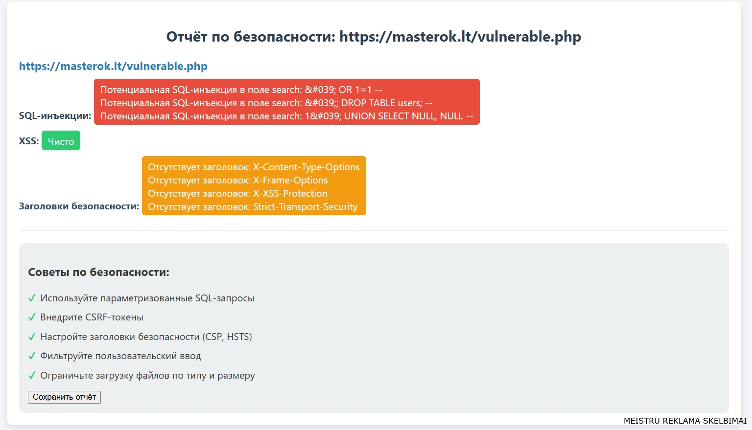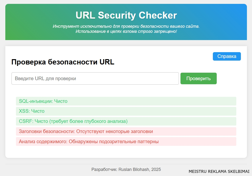 URL Security Checker - это инструмент для базового анализа безопасности веб-страниц. Скрипт помогает владельцам сайтов проверить свои ресурсы на наличие потенциальных уязвимостей и повысить уровень защиты.